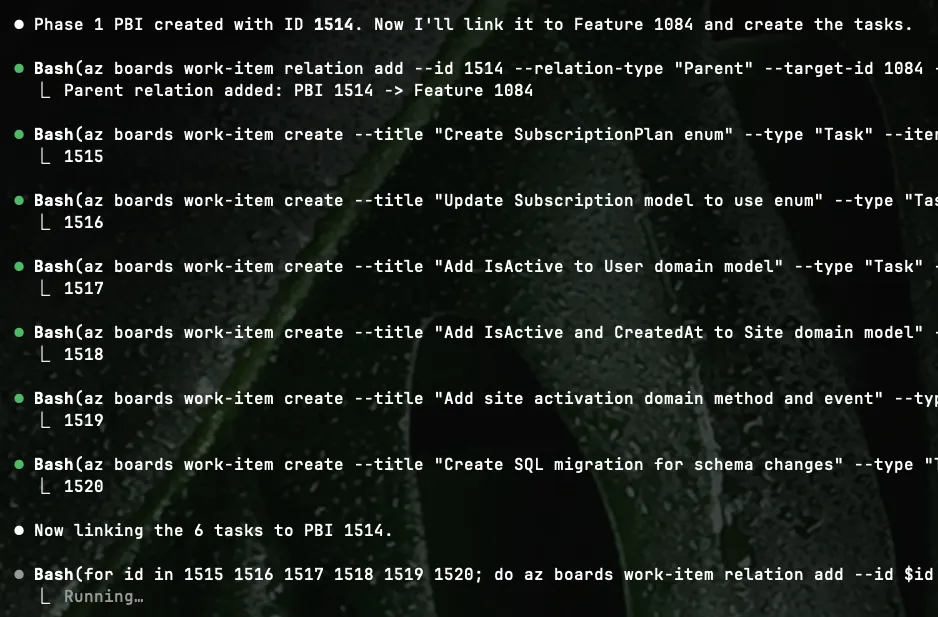 After a couple of minutes I have all the research that I did with Claude Code persisted into PBIs on my Azure Board. Tasks included.