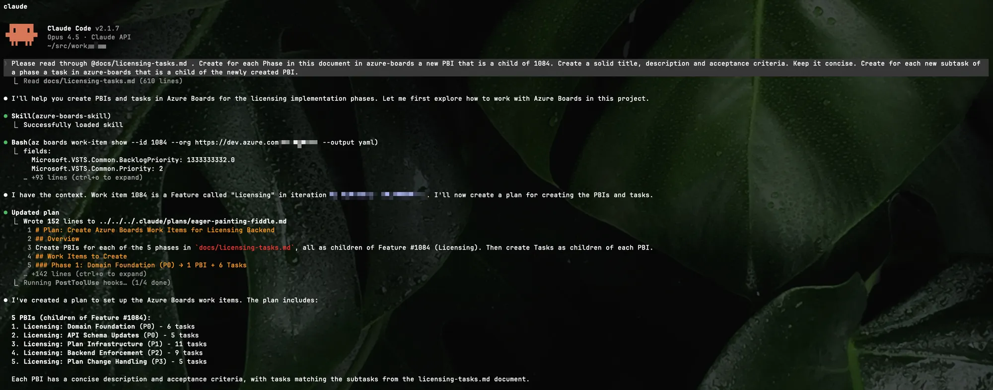 I showed how to use custom slash commands to work with PBIs. You can of course only use the skill and prompt it. In the following example I tell Claude to use the Azure Boards skill and create Product Backlog Items under an existing feature.