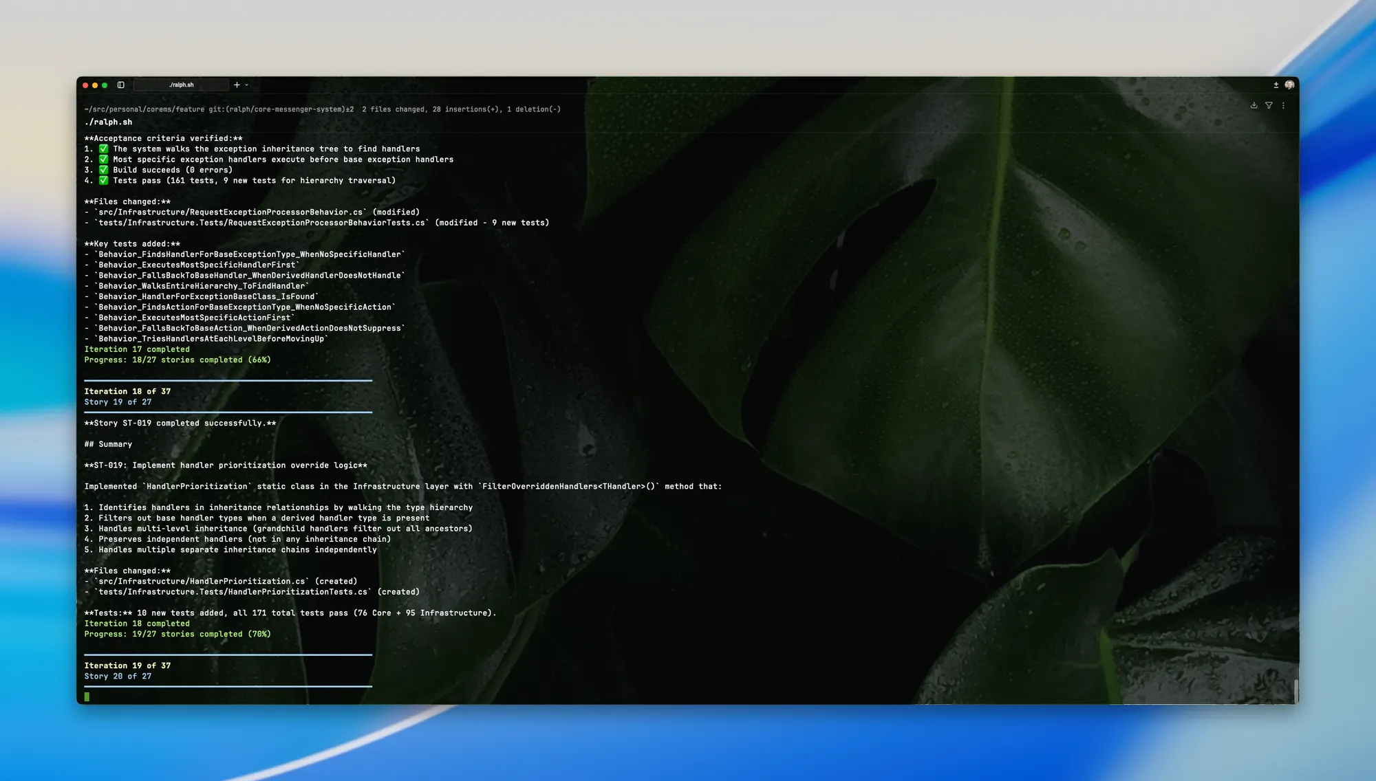 { "branchName": "ralph/feature-name", "taskDescription": "One-line summary of the task", "projectContext": { "framework": "e.g., Next.js, .NET", "testCommand": "e.g., npm test, dotnet test", "buildCommand": "e.g., npm run build, dotnet build" }, "userStories": [ { "id": "US-001", "title": "Short descriptive title", "description": "What to implement in detail", "acceptanceCriteria": [ "Specific, verifiable criterion 1", "Specific, verifiable criterion 2", "Build/test passes" ], "priority": 1, "passes": false, "notes": "Hints, gotchas, references to existing code" } ]}The prd.json, containing all features, are fed into the ralph loop. Now comes the fun part. You can do, whatever you want to do, until the loop finishes.