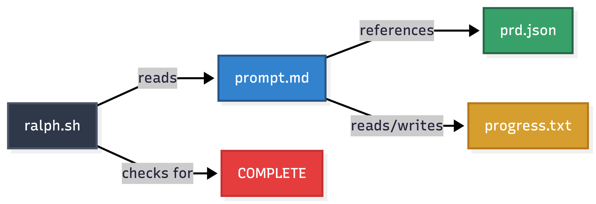 The bash script (ralph.sh) is just a while loop that pipes prompt.md to Claude Code, checks for the completion signal, and repeats. Each iteration, Claude reads the same instructions, picks the next incomplete story from prd.json, implements it, commits, and updates the progress log.